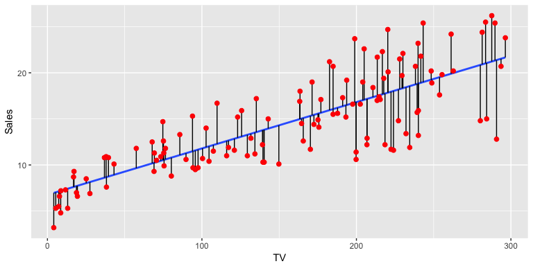 Scatterplot with regression line (blue). Vertical black lines represent residuals.